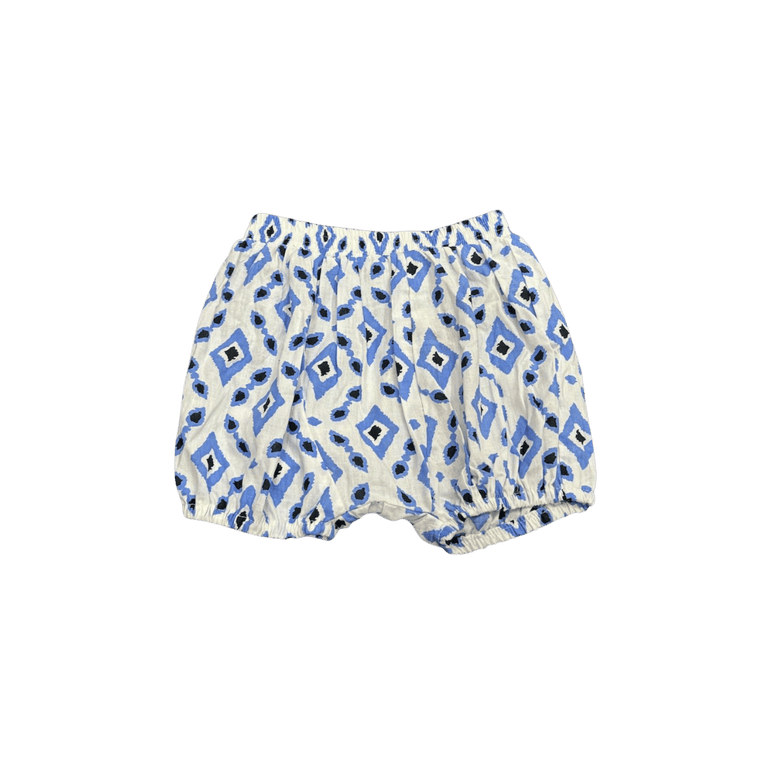 The Bloomer Shorts in Blue Diamond are a sweet and comfortable everyday essential for little ones. Made from soft, breathable cotton, this piece is designed with a fully elasticated waistband and gently elasticated leg openings for ease of movement and all-day comfort. The hand-dyed blue diamond pattern adds a playful, artisanal touch, making each piece unique.