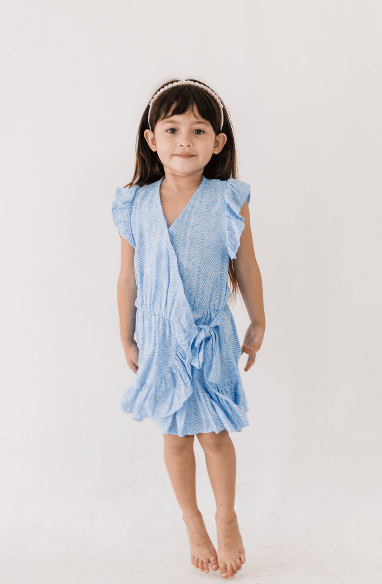 Mini-wrap Dress! Meet Cabini, a charming and versatile mini-wrap dress designed for easy comfort. The elastic and tie-up waist ensure a perfect fit, while the frills add a playful twist to the classic design. With a button snap on top and made from soft, breathable rayon in an exclusive hand-printed, this dress is sure to make your mini babe feel both comfortable and elegant on every occasion.