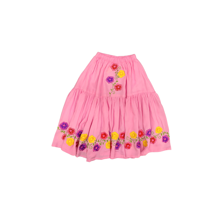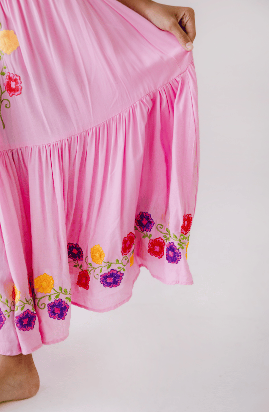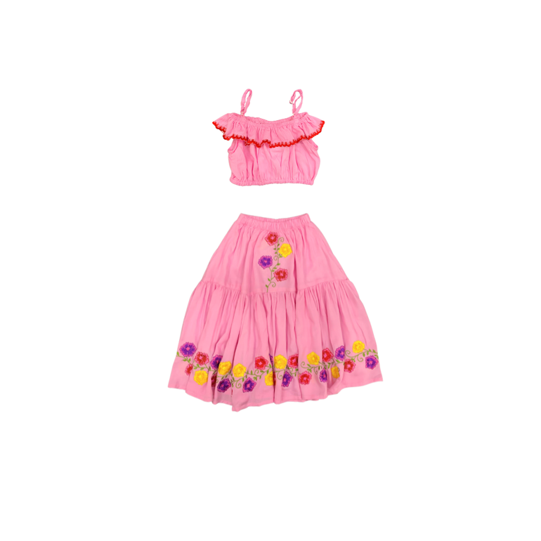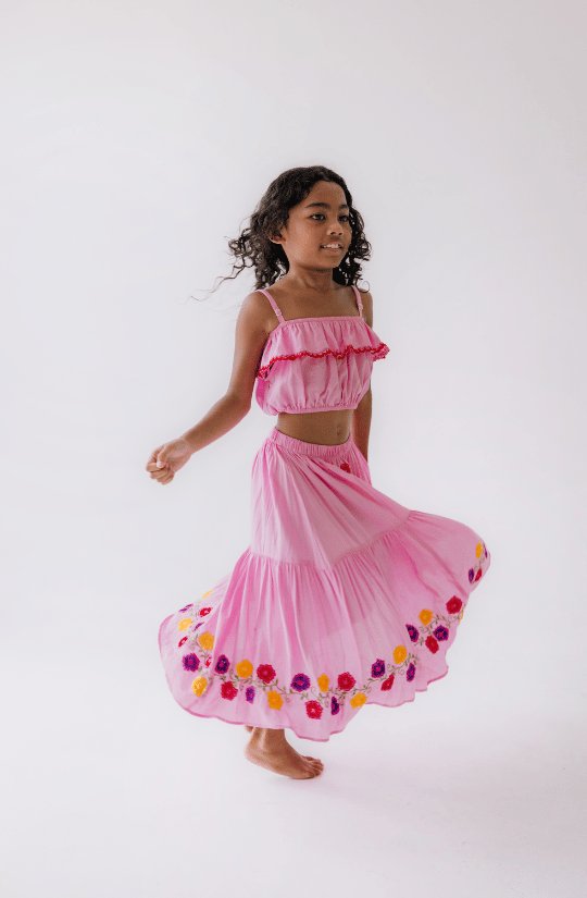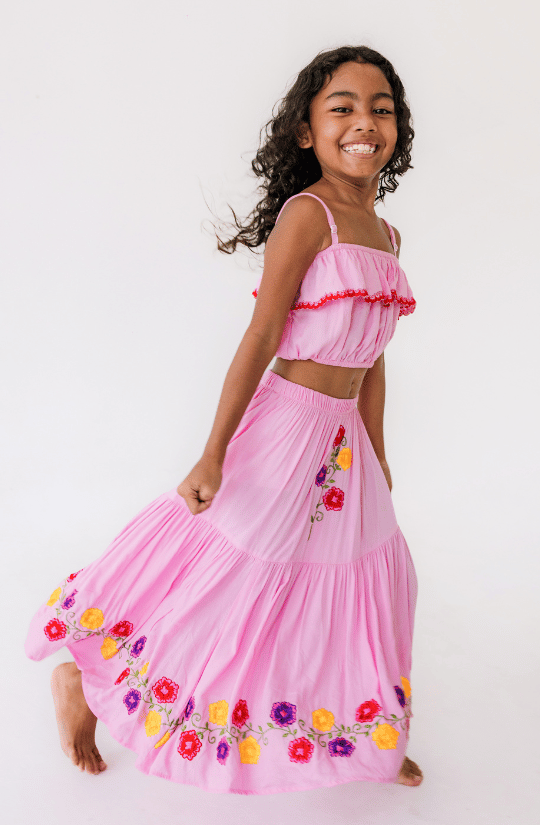 The Salwa Set is a sunshine-ready two-piece featuring a cropped top and flowing skirt made from soft rayon in our pink with hand embroidery. The top has delicate ruffle sleeves and elastic for comfort, while the tiered skirt drapes beautifully for twirls and movement. Perfect for holidays, birthdays, and warm, carefree days.