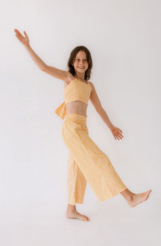 Bright, bold, and beautifully playful — the Stromi Set is a sunshine favorite. Featuring a cropped top with a charming tie-up back and matching wide-leg pants in our cheerful Orange Nique print, this outfit is made for days filled with fun and color. The soft rayon fabric gives it a breezy drape and all-day comfort.