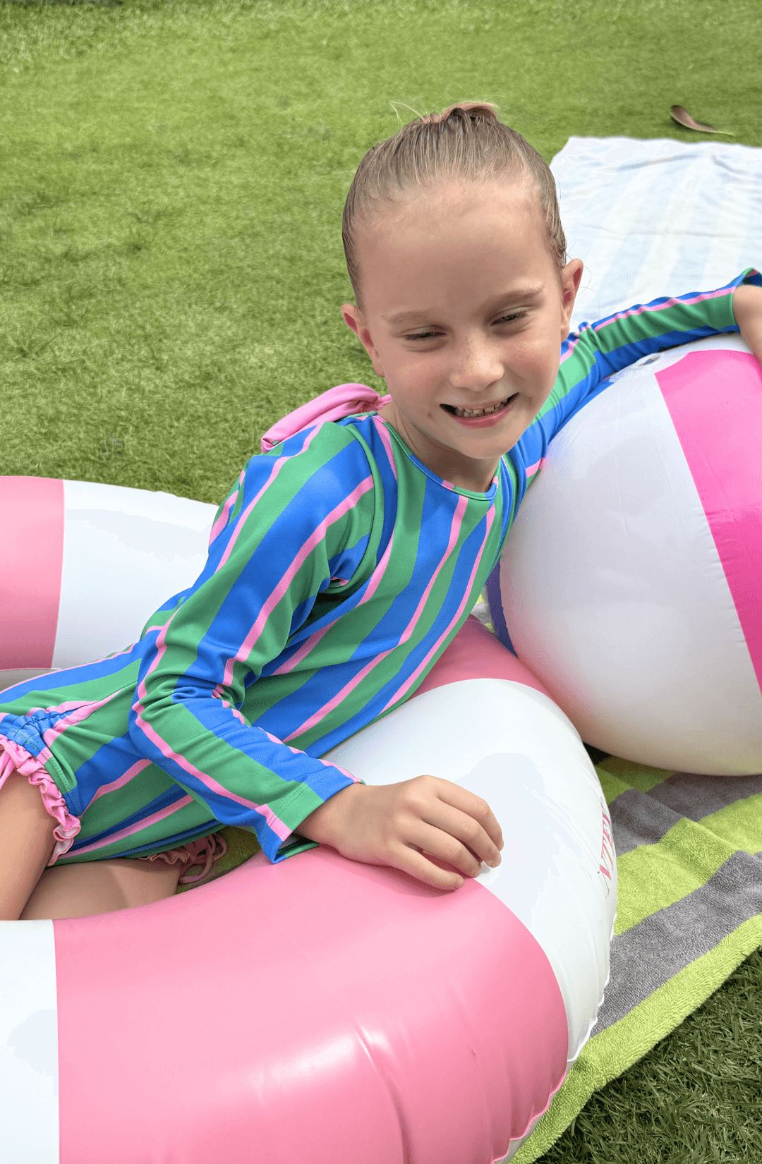 Rashie One Piece in Caprie Stripe Shamrock Green French Blue Pink