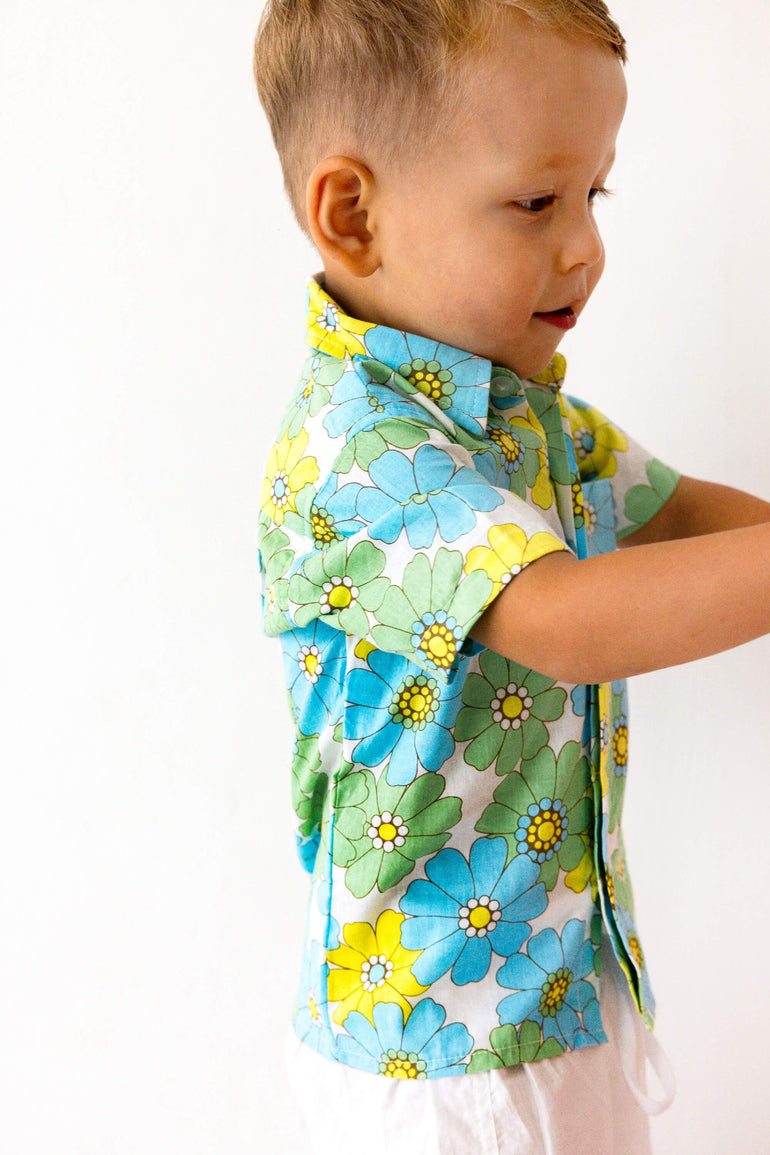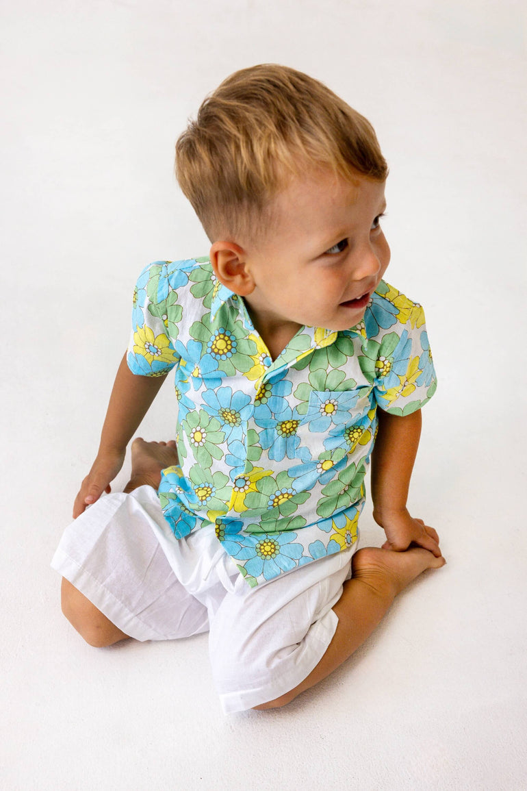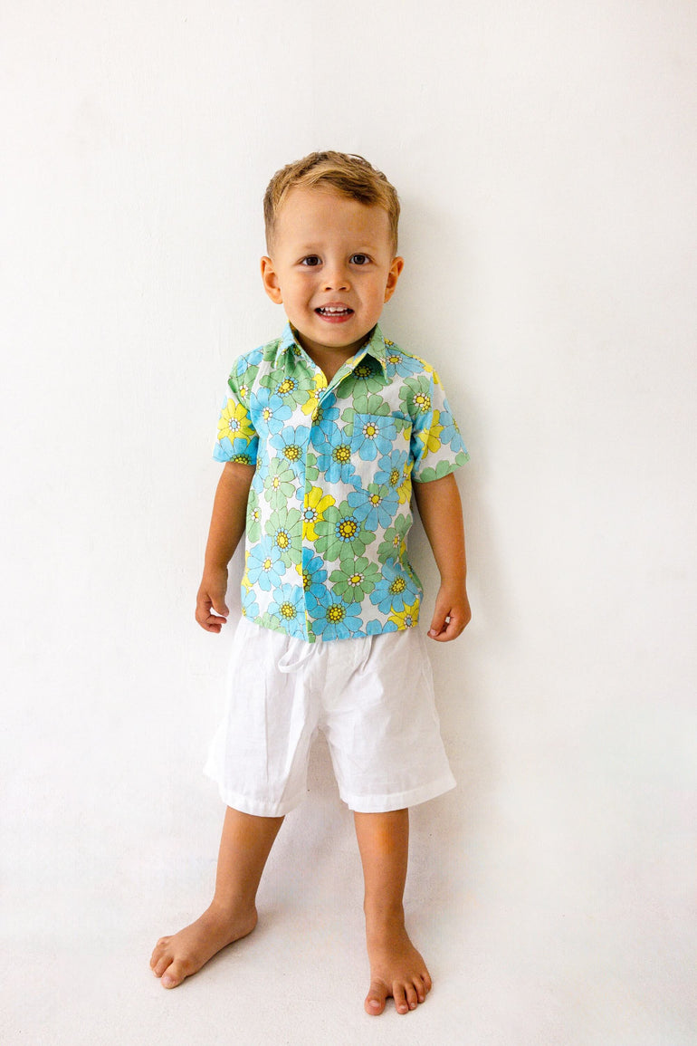 Two Piece Set. Printed button up shirt with short sleeves, and shorts with elastic for an easy fit. 100% Cotton.