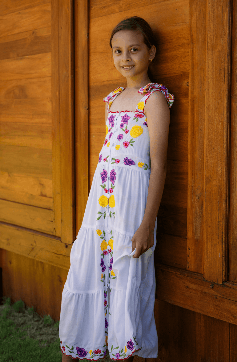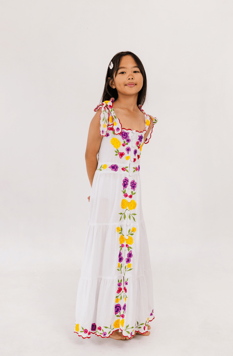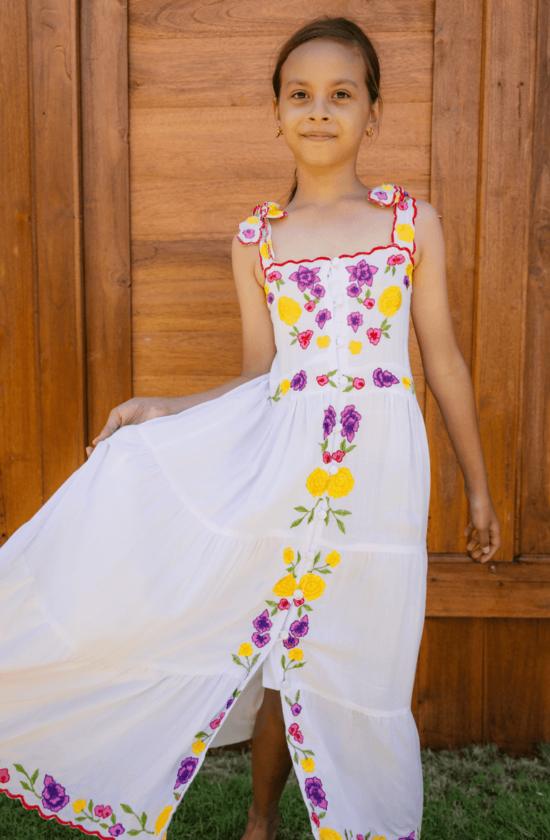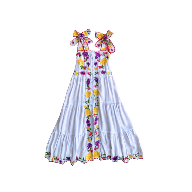 The Lesti Maxi Dress is a stunning statement piece crafted in soft white rayon and beautifully finished with hand-embroidered floral detailing. Featuring a bodice, delicate shoulder ties, and a flowing tiered skirt, this dress captures the spirit of island elegance and carefree play. Each piece is lovingly embroidered by hand, making every dress truly one of a kind.