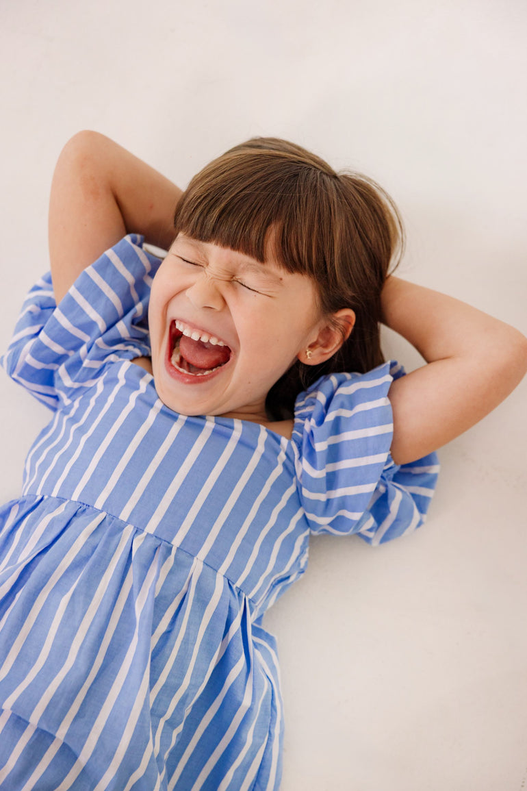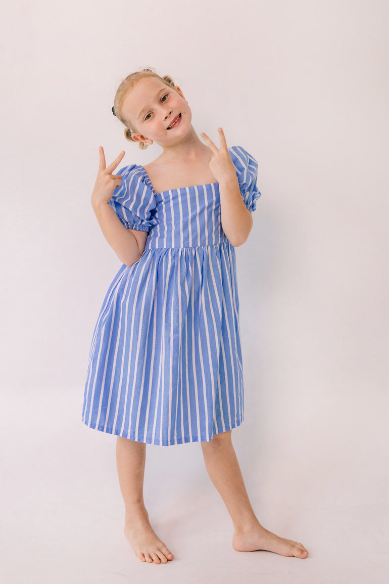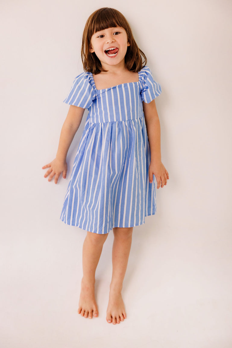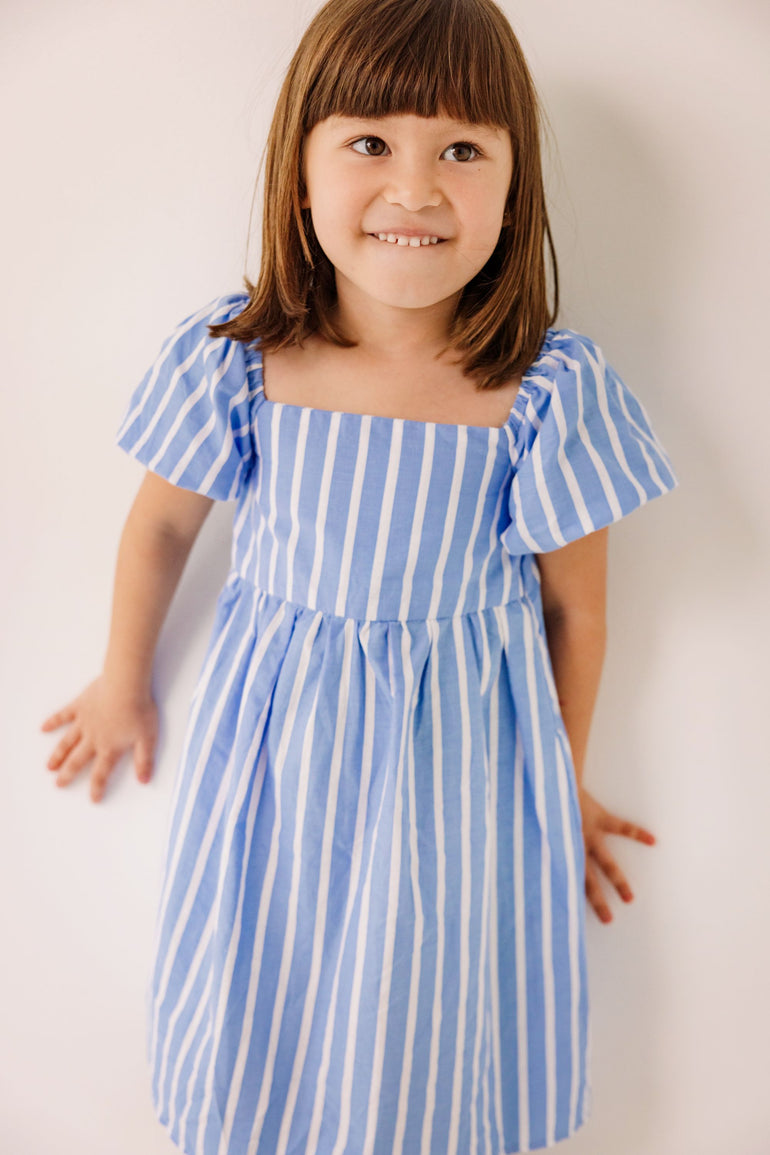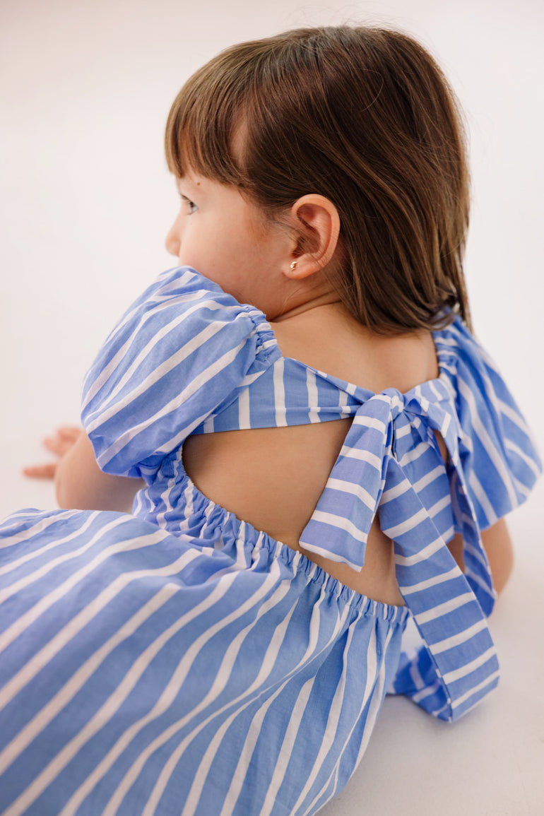 The Rachel Dress is a charming modern classic made from soft cotton in our Stripe print. Featuring puff sleeves, a square neckline, and a statement bow tie at the back, this dress is both playful and elegant. The gathered skirt and open-back detail add a breezy touch — perfect for sunny days, parties, and twirls.
